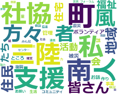 下図は、宮城県の南三陸町社会福祉協議会が2024年に開催した「小さな社協のこだわりフォーラム」(YouYubeで全議題の映像・音声が公開されています)における同町の福祉の未来像に関する参加者の発言内容を、当社がテキストデータ化した上でワードクラウドに表したものです。「コミュニティ」、「ボランティア」、「連携」といったキーワードの存在を確認することができることから、同社会福祉協議会メンバー向けワークショップに提出し、参加者同士の意見交換に活用しました。