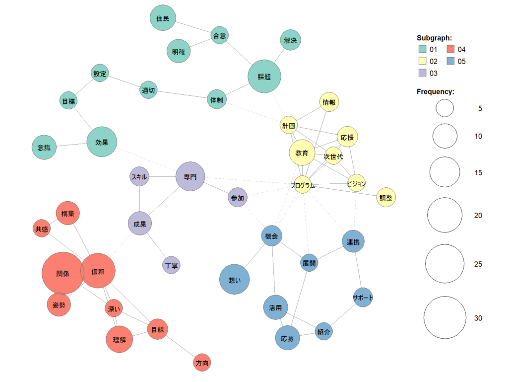 下図は、復興庁が公開している『地域づくりハンズオン支援事業ハンドブック』(2025年3月発行)に載っている、ハンズオン支援実施上の要点に関する関係者(支援専門家)のコメントをテキストデータ化した上で、共起ネットワーク図にしたものです。関係性が強い単語をグループ化することで意味や文脈を読み取ることができます。この場合、課題解決に向けた合意(緑色)、ビジョン実現のための計画・プログラム作り(黄色)、専門性を有する人による支援(紫色)、関係者同士の共感・相互理解(赤色)、団体間連携や支援事業の活用(青色)などが支援の成否を左右するポイントであることが窺われます。