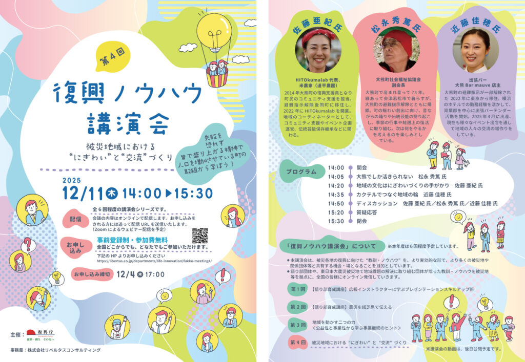 連絡先 復興ノウハウ講演会事務局(㈱リベルタス・コンサルティング内、担当:富永・五十嵐)